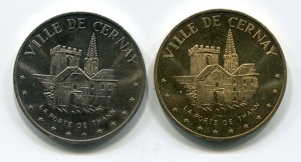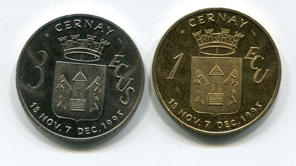 FRANCE - PRECURSEURS MONNAIE EUROPEENNE " écus des villes " MONNAIES TEMPORAIRES " - ECUS de CERNAY (68), série de 2 monnaies de 1 écu laiton + 3 écu nickel, blason de ville à l'avers, Porte de Thann au revers - LES DEUX SUP.