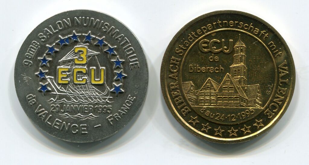 ( * ) - Période durant laquelle les commerçants locaux acceptaient ces monnaies en paiement afin de promouvoir et sensibiliser le public à l'introduction de la future monnaie européenne, alors décidée d'être appelée ECU (européen Currency unit), et qui finalement sera annoncée sous le nom d'Euro.