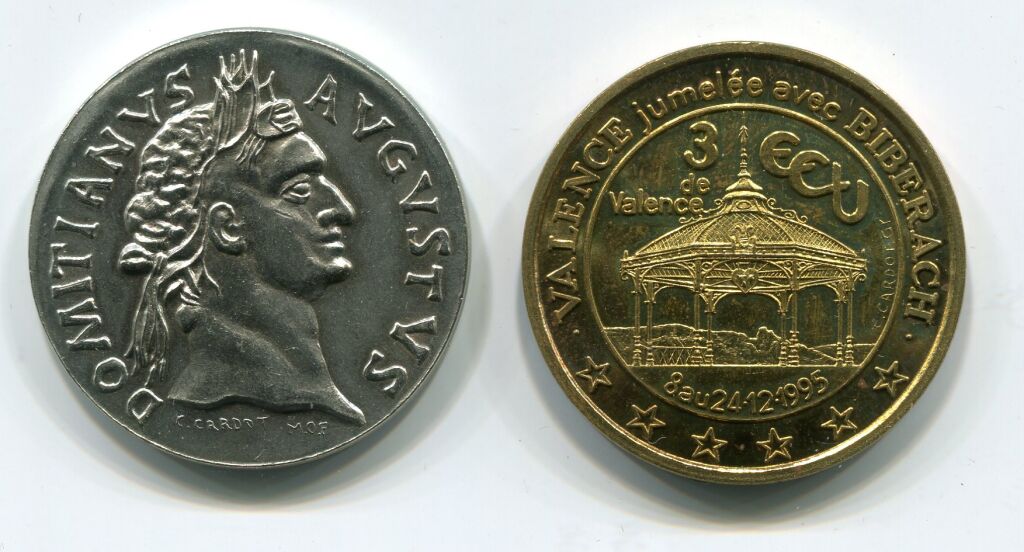 - 3 écu métal argenté et émail de couleur. Portrait d'Auguste fondateur de Valence. Au dos Galère romaine. Frappé à l'occasion du 9e salon numismatique du 29 janvier 1995 (*)