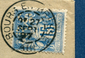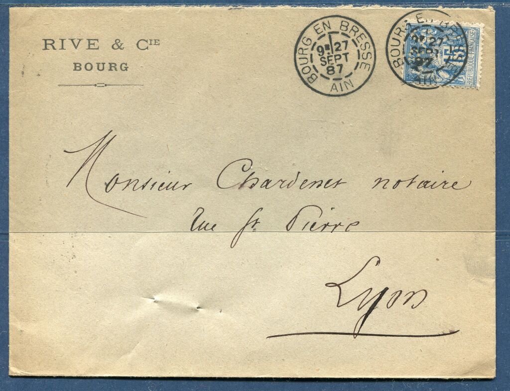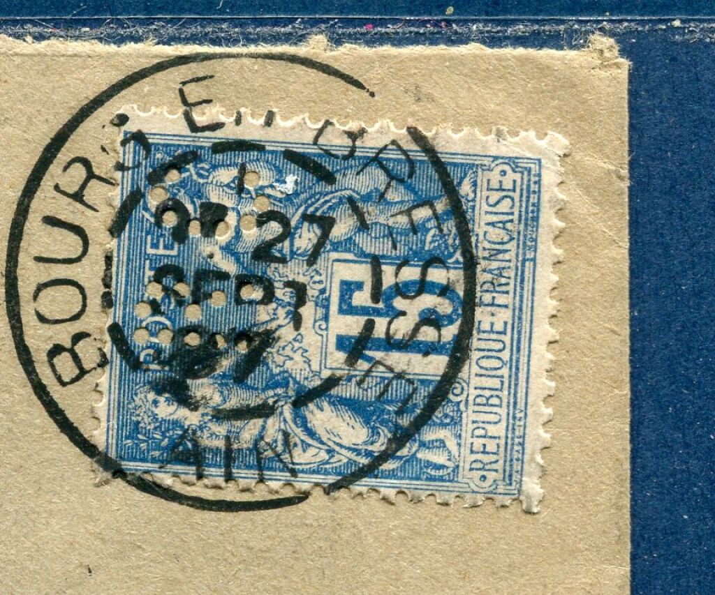 Perforation " R.C. "affranchissement 15c bleu au type Sage n° 77, cachet à date au type 18, "bourg en Bresse Ain 27 septembre 1887 ".