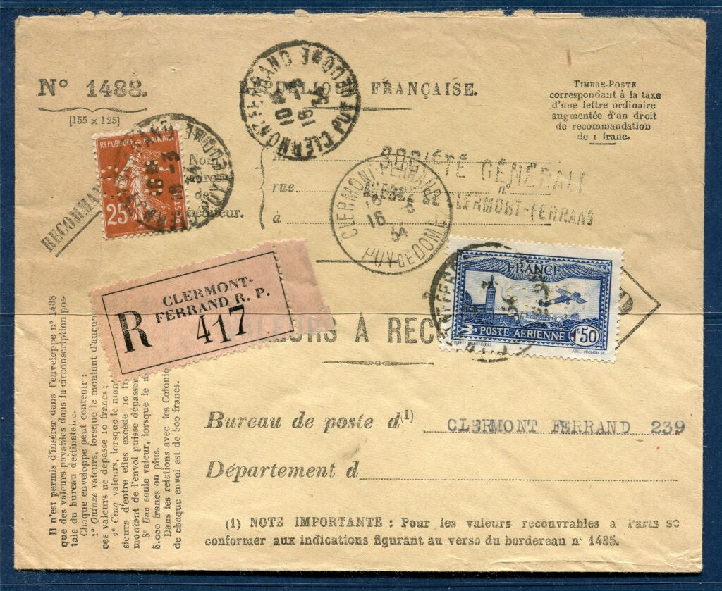 Enveloppe spéciale " valeur à recouvrer " (formule n° 1488) expédiée par la SOCIETE GENERALE, AGENCE de CLERMONT Fd - les 2 timbres avec perforation " S.G. "