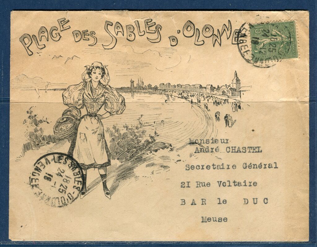 Enveloppe 113 x 145 mm bien illustrée d'une sablaise en costume traditionnel, baie des sables et lettres dessinées. Affranchissement semeuse lignée 15c vert n° 130, cachet à date "les sables d'Olonne" 24 janvier 1918.