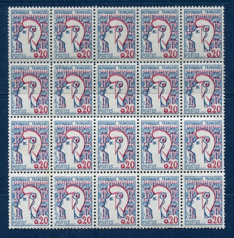 FRANCE VARIETE - 0 F 20 Marianne de Cocteau au type II, n° 1282 h, CHIFFRES DEDOUBLES. - Bloc de 20 (vingt) timbres neufs **