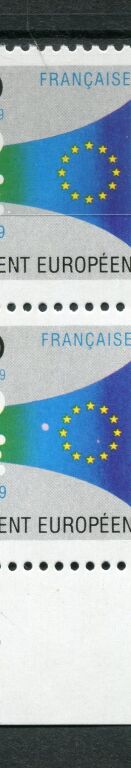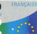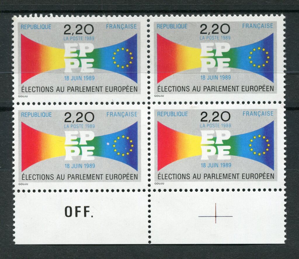 FRANCE VARIETE - 3e ELECTIONS au PARLEMENT EUROPEEN 1989 n° 2572 b, timbre AVEC ANNEAU LUNE (tache devant les 12 étoiles) - Une présentation luxe : timbre variété en position 4 dans un bloc de quatre bas de feuille avec bordure portant croix de repère d'impression et mention machine OFF (offset) - les 4 timbres neufs **.