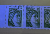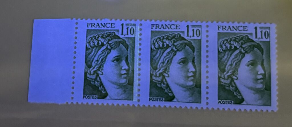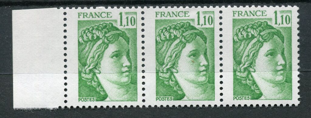 FRANCE VARIETE - SABINE de Gandon 1 F 10 vert - Bande horizontale de 3 timbres bord de feuille - le timbre de gauche porte une bande de phosphore à droite, les 2 autres timbres sont sans phosphore (voir photo sous ultra violet). - timbres neufs **.