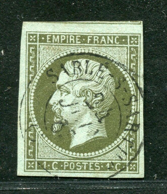 FRANCE VARIETE - un centime NAPOLEON III non dentelé n° 11 olive, 4 belles marges, belle oblitération, légère, cachet à date au type 15, en centre du timbre, complète, SABLE SUR SARTHE 24 juin (1865).