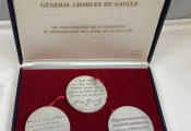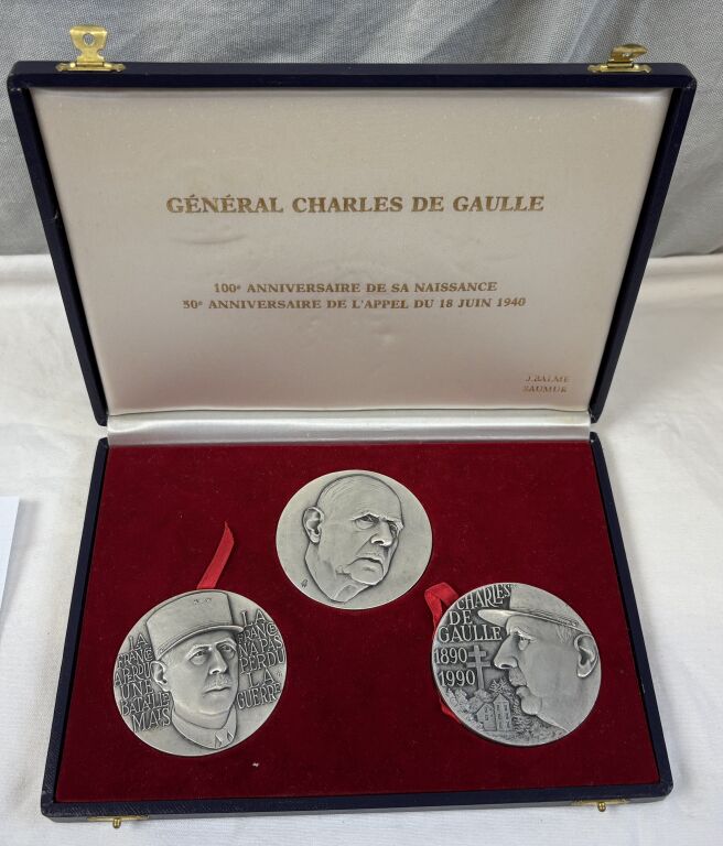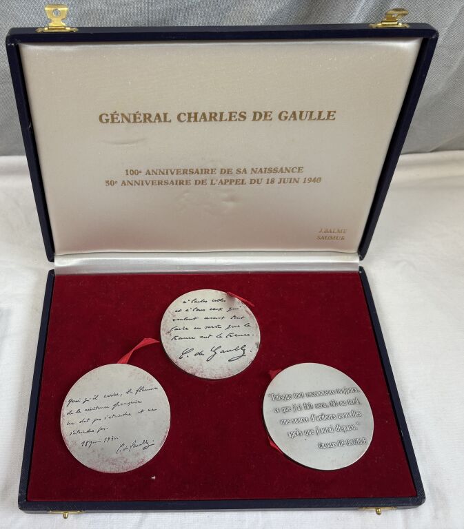 GENERAL CHARLES de GAULLE - 100e anniversaire de sa naissance et 50e de l'Appel du 18 juin 1940 - coffret commémoratif de 3 médailles de table de 70 mm :