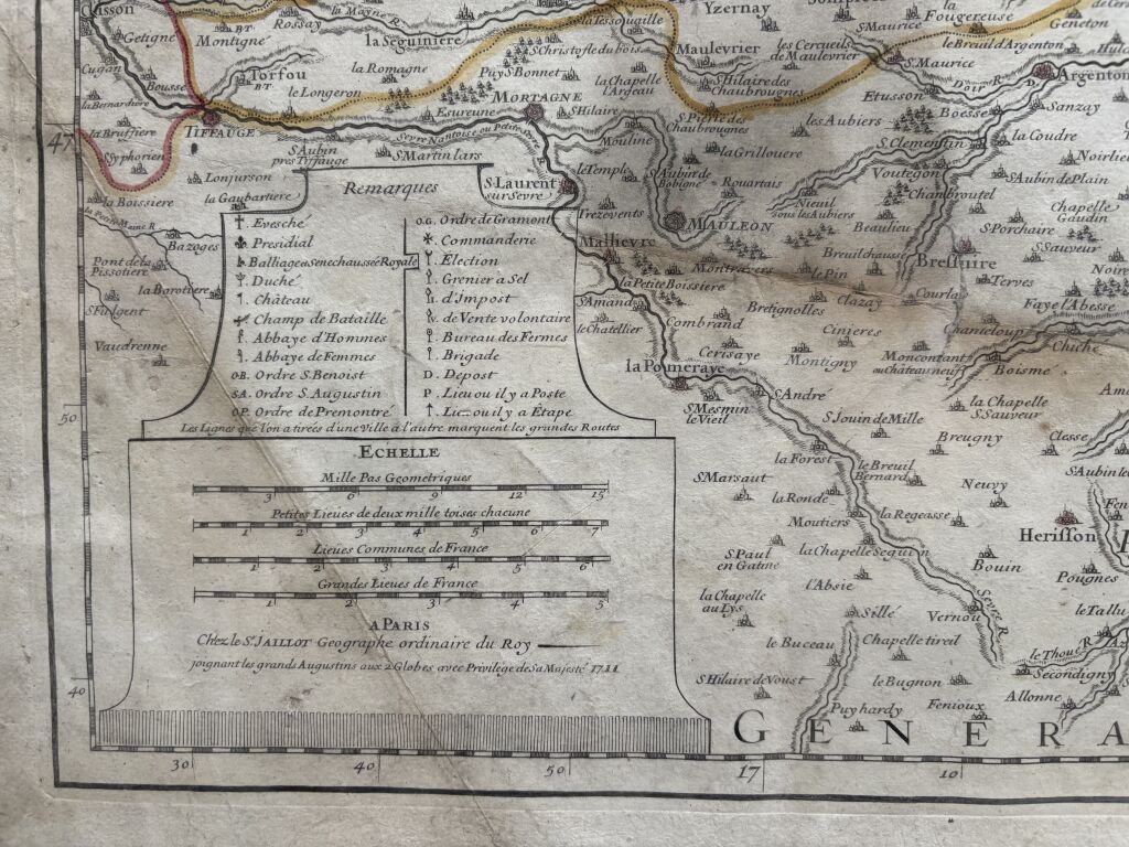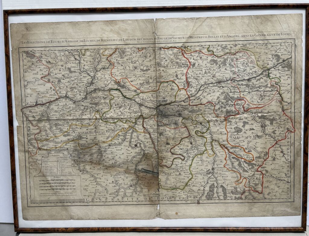 grande CARTE GEOGRAPHIQUE MURALE début 18e siècle " LES ESLECTIONS de TOURS, d' AMBOISE, DE LOCHES, de RICHELIEU, de LOUDUN, de CHINON, de BAUGE, de SAUMUR, de MONTREUIL BELLAY et d' ANGERS dans la GENERALITE de TOURS, 1711, dressée par le Sieur JAILLOT ( * ), géographe ordinaire du Roy, joignant les Grands Augustins, aux 2 globes avec privilège de sa majesté ". - Belle gravure taille douce sur cuivre colorisée. Format 54 x 77 cm.