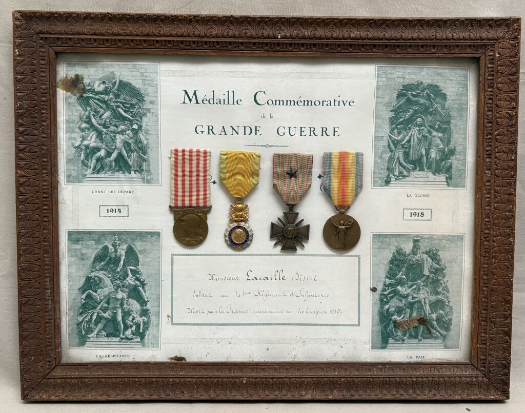 Cadre sous verre moulures bois contenant ses 4 décorations : commémorative 1914-1918, MEDAILLE MILITAIRE, CROIX de GUERRE avec étoile, médaille Interalliée de Morlon.