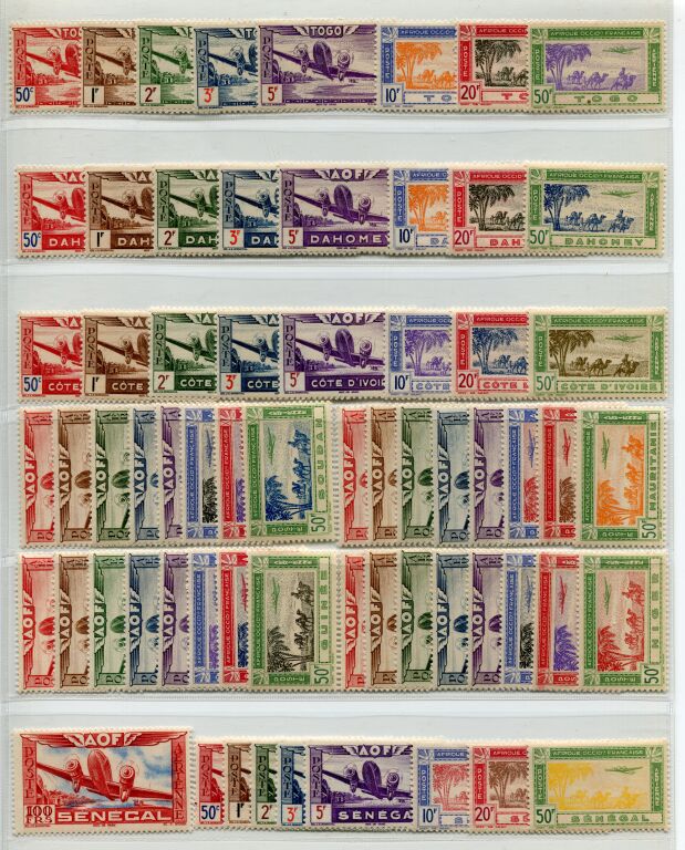 GRANDES SERIES COLONIALES FRANCAISES - SERIE AVIATION 1942, émission du 19 octobre, avion au décollage et caravane de chameaux - 65 timbres pour les 8 colonies de l' A.O.F. : Côte d'Ivoire, Dahomey, Guinée, Mauritanie, Niger, Sénégal, Soudan, Togo.