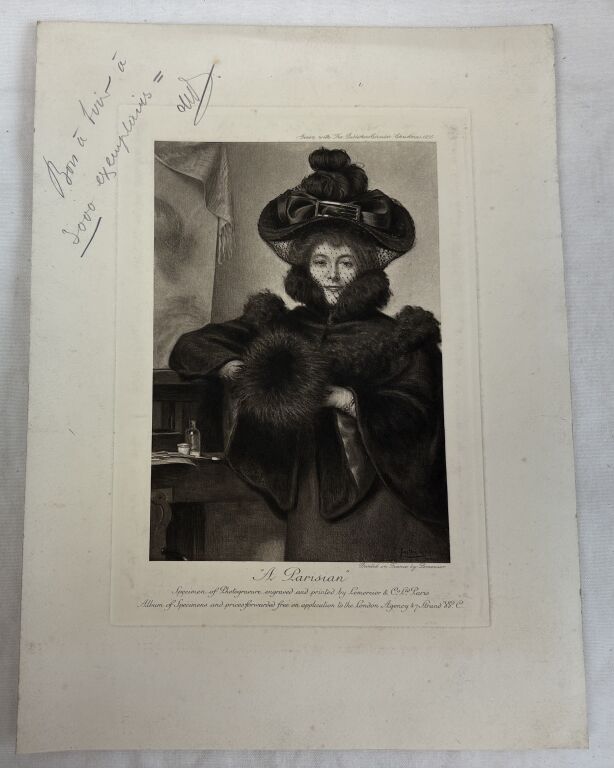 Impression publicitaire de LEMERCIER " offerte avec sa circulaire publicitaire ", au marché de langue anglaise, pour le noël 1895 - " spécimen de photogravure gravé et imprimé par Lemercier à Paris, catalogue de spécimens et prix à demander à notre agence de Londres, 47 strand " - Fine impression d'une jeune femme au manchon, de face, suivant l'œuvre du peintre luxembourgeois (1861 - 1940) Gaston LINDEN.