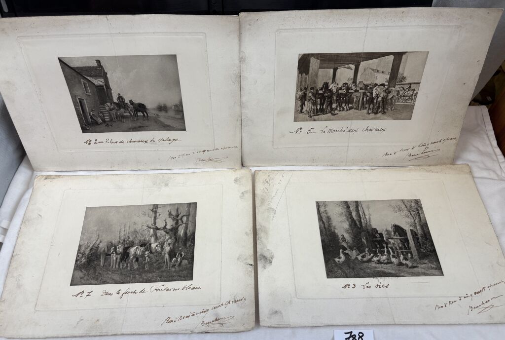 GRAVURES - CINQ bons à tirer, portant traces de manipulation d'imprimeur, annotations au crayon et bon à tier de LITHOGRAPHIES de l'éditeur et imprimeur LEMERCIER ( * ) - Illustrations en centre sur vélin dans une cuvette sur vélin 22,5 x 32 cm :