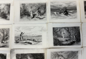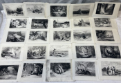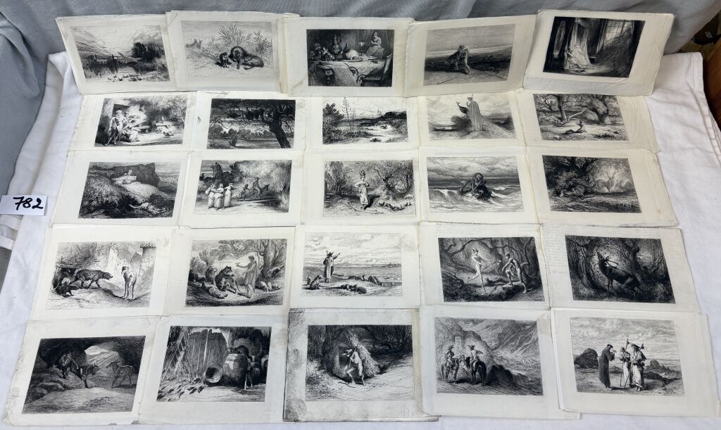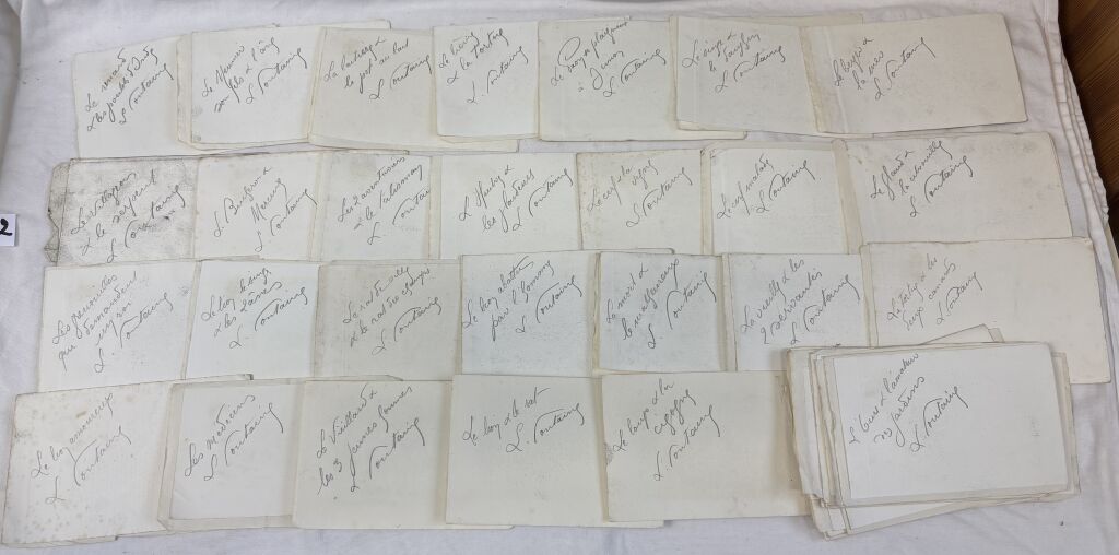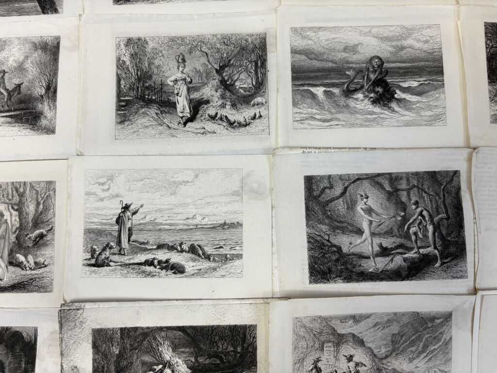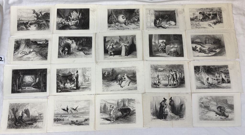 65 x 94 mm, sur support 90 x 140 mm - OEuvres d'illustration d'un ouvrage sur les fables de la Fontaine - circa 1880, exemplaires pour archives de l' éditeur CHARDON Ainé & Fils, graveur, imprimeur d'art et éditeur à Paris 12 rue de l'Abbaye. En règle générale ces fines épreuves gravées sont sur un support carton avec au dos légende de l'œuvre. - COLLECTION de 45 (quarante cinq) GRAVURES, et en particulier des œuvres peu connues de La Fontaine : le renard, les mouches & le hérisson - conseil tenu par les rats - le rat qui s'était retiré du monde - conseil tenu par les rats - le singe & le chat - le rat & l'éléphant - les 2 rats, le renard & l'œuf - les animaux malades de la peste - la vieille & les 2 servantes - le lion amoureux - le vieillard & les 3 jeunes hommes - le loup & la cigogne - la tortue & les 2 canards - l'ours & l'amateur des jardins - les médecins - le lion & le rat - le renard & les poulets d'inde - le lièvre & la tortue - le Paon se plaignent à Junon - le gland & la citrouille - la pâtre & le lion - le meunier, son fils & l'homme - la laitière & le pot au lait - le singe & le dauphin - le cerf malade - le berger & la mer - le bucheron & mercure - le cerf & la vigne - le villageois & le serpent - les 2 aventuriers & le talisman - l'huitre & les plaideurs - les grenouilles qui demandent un roi - le lion, le singe & les 2 ânes - le rat de ville & le rat des champs - le lion abattu par l'homme - la mort & le malheureux.