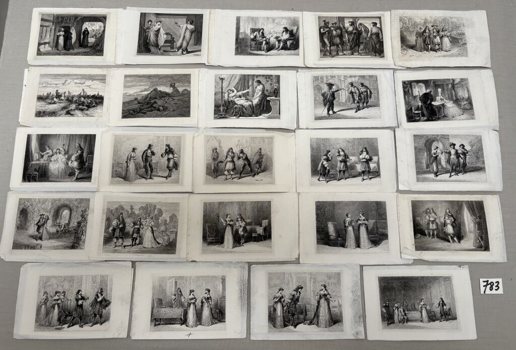 65 x 94 mm, sur support 90 x 140 mm - OEuvres d'illustration d'un ouvrage Molière - circa 1880, exemplaires pour archives de l' éditeur CHARDON Ainé & Fils, graveur, imprimeur d'art et éditeur à Paris 12 rue de l'Abbaye.