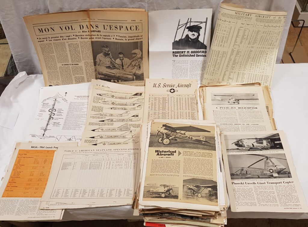 Grosse masse de documentation ( épaisseur 9 cm ), réunion de documents d' un journaliste spécialisé, pour la préparation d' articles : listings d' appareils, plans d' intérieurs d' aéroports, programme de lancement de la N.A.S.A., modèles d' avions avec leurs spécifications, personnalités de l' aéronautique etc.... sur les années 20 aux années 50 / 60 environ.