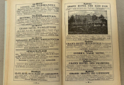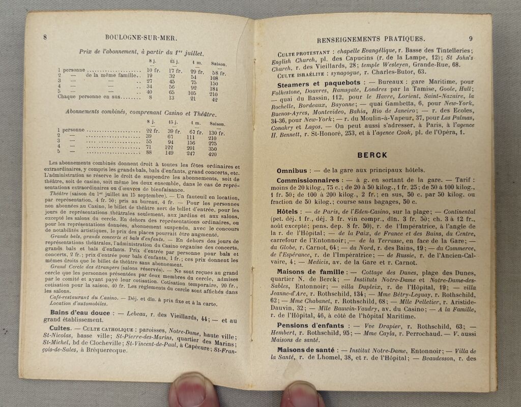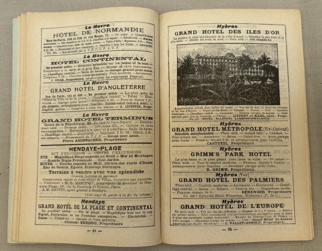 Renseignements pratiques sur les villes et environs : publicités des hôtels, des agences de locations, pharmacie, parfumeries et autres commerces, chemins de fer, thermalisme éventuel, tarifs pour les trains, voitures de place des hôtels, restaurants, musées, bains, casinos - Histoire des lieux, photographies des lieux remarquables; cartes géographiques souvent dépliantes. - En fin d'ouvrage 150 pages de publicités illustrées des grands hôtels de toute la France, grande bretagne, Espagne...