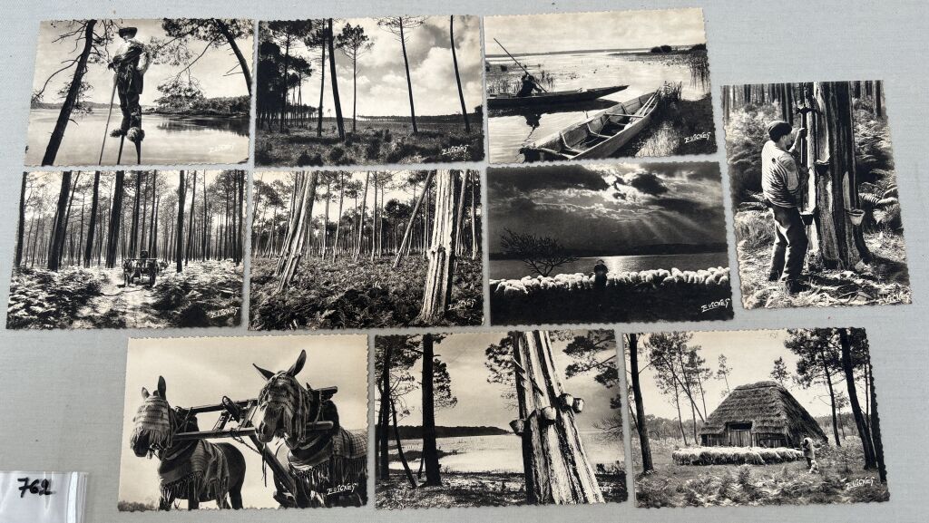 GUYENNE / GASCOGNE - DIX cartes postales différentes, circa 1940, impression héliogravure édition et photographies d' EMILE VIGNES ( * ). - Un hommage rendu aux Landes : Échassier au bord d'un lac, paysage de la lande Gasconne, sur les lacs landais, berger Landais (cabane & moutons), attelage de mules en forêt, nos sous bois de pins & fougères, gemmeur qui fait l'entaille, un soir au bord des lacs, un des plus beaux lacs de notre côte d'argent, attelage de mules landaises