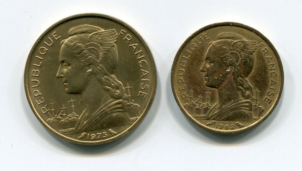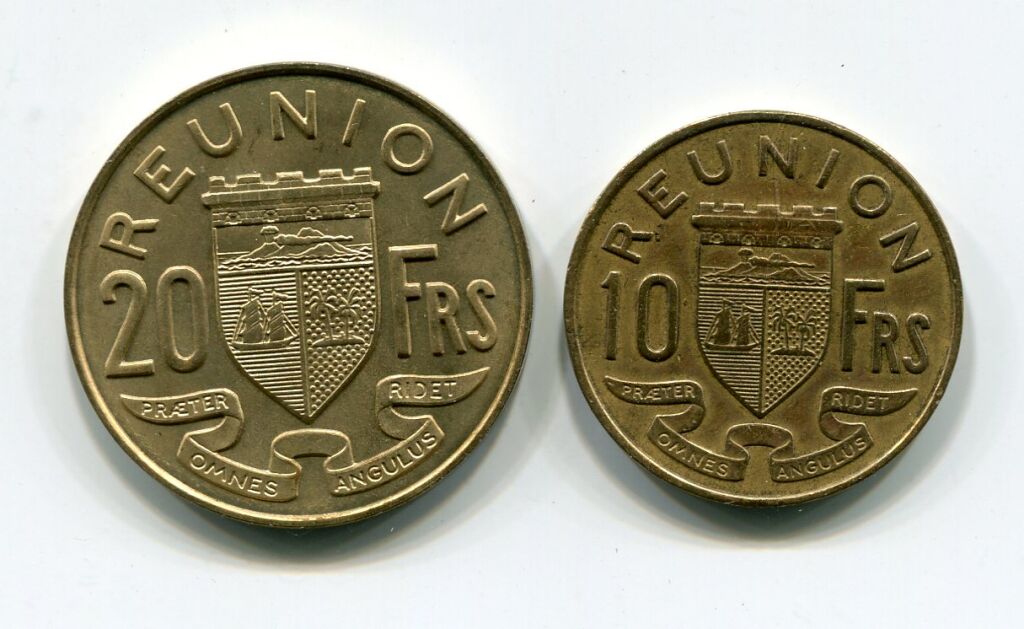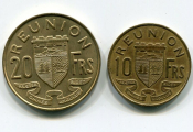 ILE de la REUNION, Département d'Outre Mer - DEUX MONNAIES du graveur Bazor, atelier de Paris, en bronze-aluminium - Blason du département et la République tête ailée :