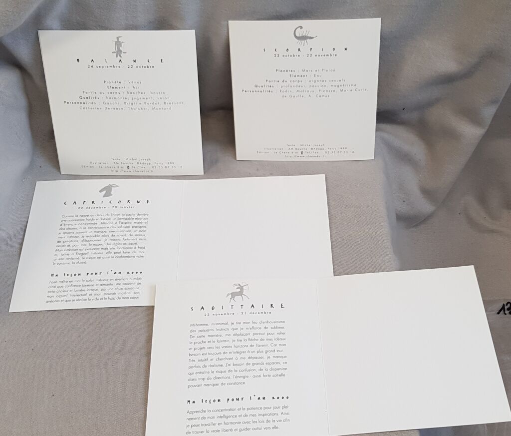 Dépliantes 15,8 x 15,8 cm, textes de Michel Joseph pour chacun des signes, une face pour la correspondance. - Impression offset quadrichromie, tirage 2000 exemplaires.