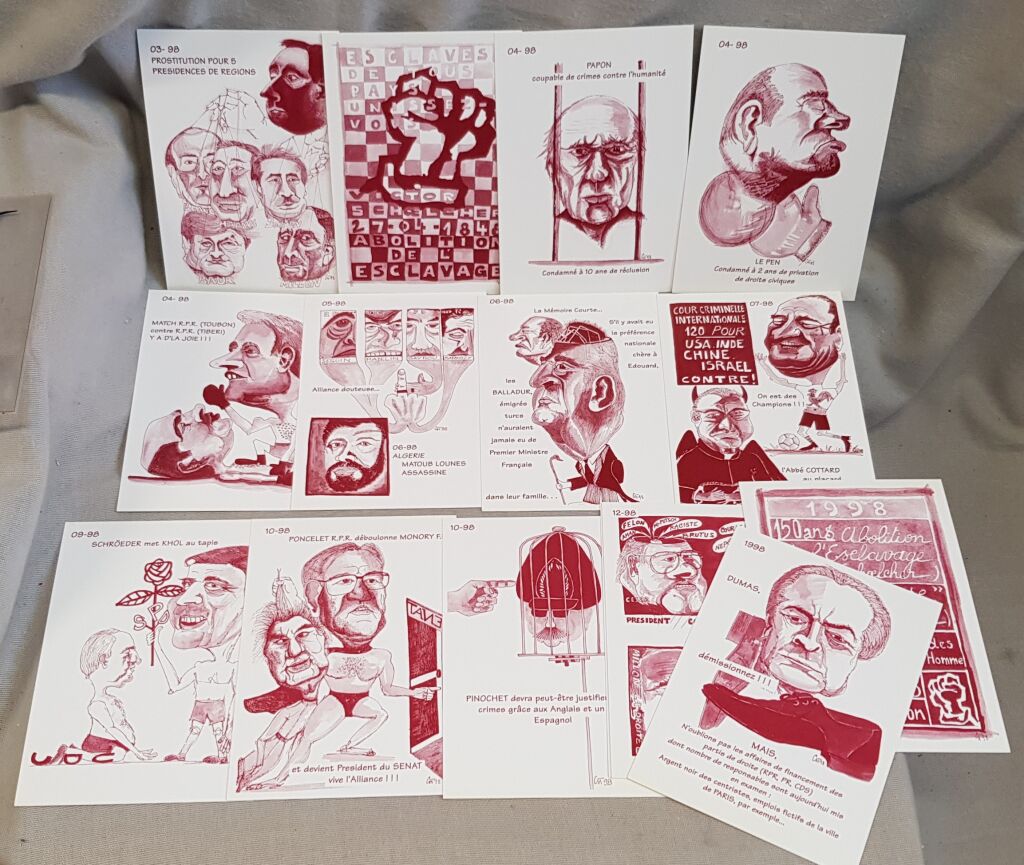 collection de 15 cartes postales / caricatures politiques sur l' actualité politique de l' année : présidents de région élus grâce au F.N., 150 ans abolition esclavage, Papon coupable, le Pen condamné, rivalités pour le trône de la mairie de Paris, assassinat du chanteur algérien Matoub Lounes, Balladur, l' Allemagne, Pinochet, Elf, Monika gâte aux U.S.A...