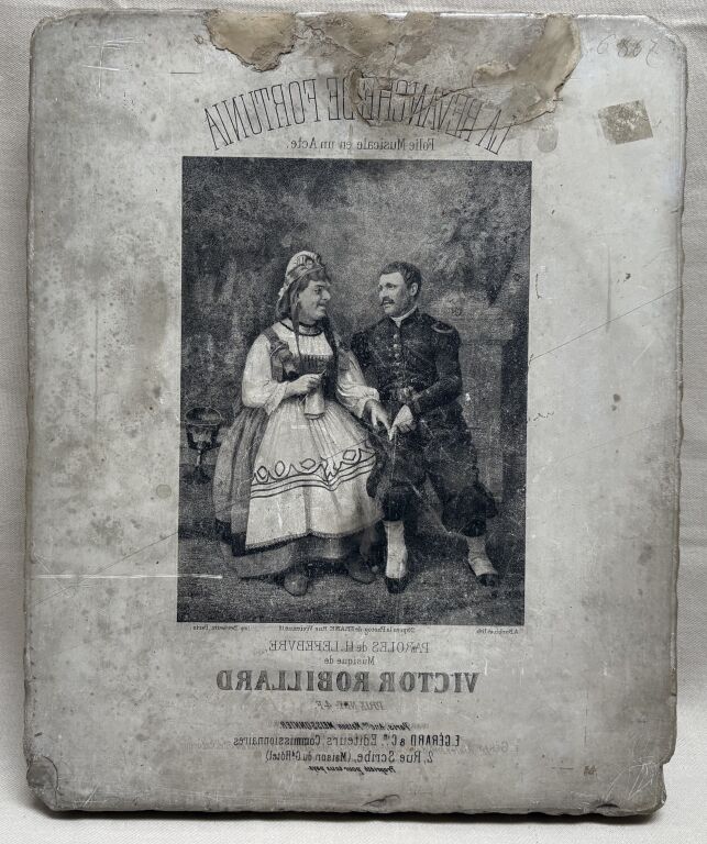 IMPRIMERIE 1880 / 1890 - PIERRE LITHOGRAPHIQUE 29 x 24 cm, épaisseur 3 cm, pour impression livret de LA REVANCHE de FORTUNA, FOLIE MUSICALE en 1 acte, paroles de H. Lefebvre, Musique de Victor Robillard. - Belle illustration en centre, 17 x 13 cm, soldat et son épouse avec beau graphisme - Réalisation du Lithographe Barbizet pour les éditions ancienne maison Meissonnier -E. Gérard et Cie 2 rue Scribe, maison du Gd Hôtel- d'après la photographie de Franck, rue Vivienne 18 - Imprimerie Bertants Paris.