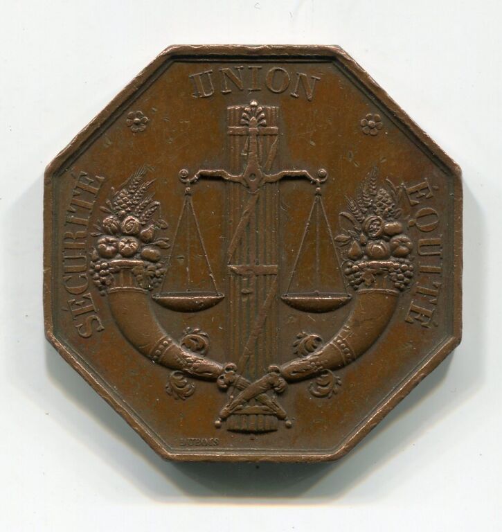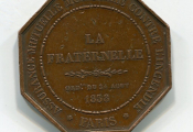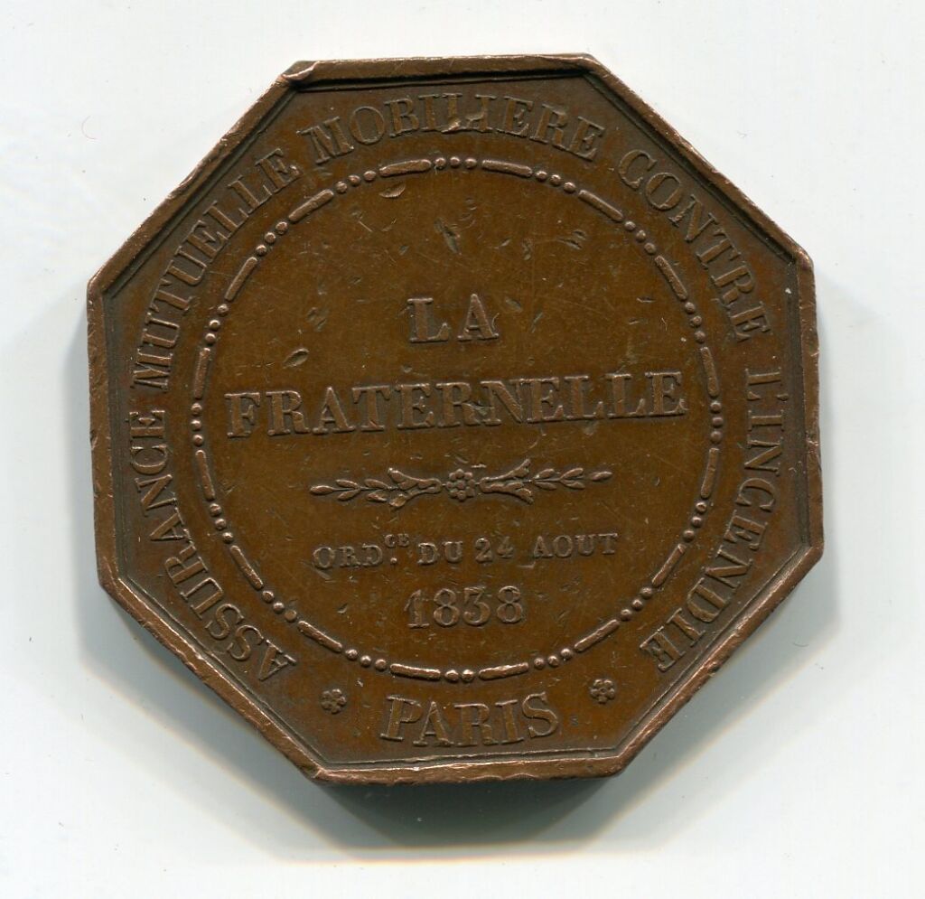 JETON D' ASSURANCE - LA FRATERNELLE, ( * ) ordonnance du 24 août 1838 Assurance Mutuelle Mobilière contre l' Incendie - PARIS - revers : balance sur faisceau licteur, au devant 2 cornes d'abondance remplies de fruits légende SECURITE / UNION / EQUITE.