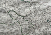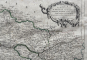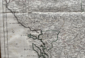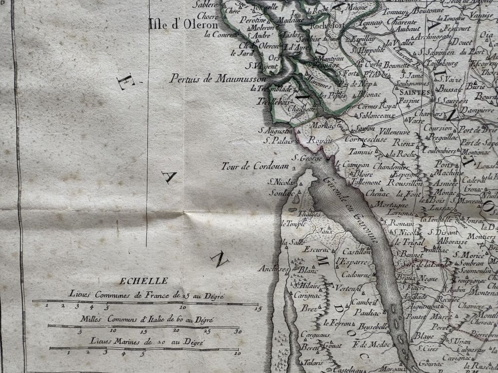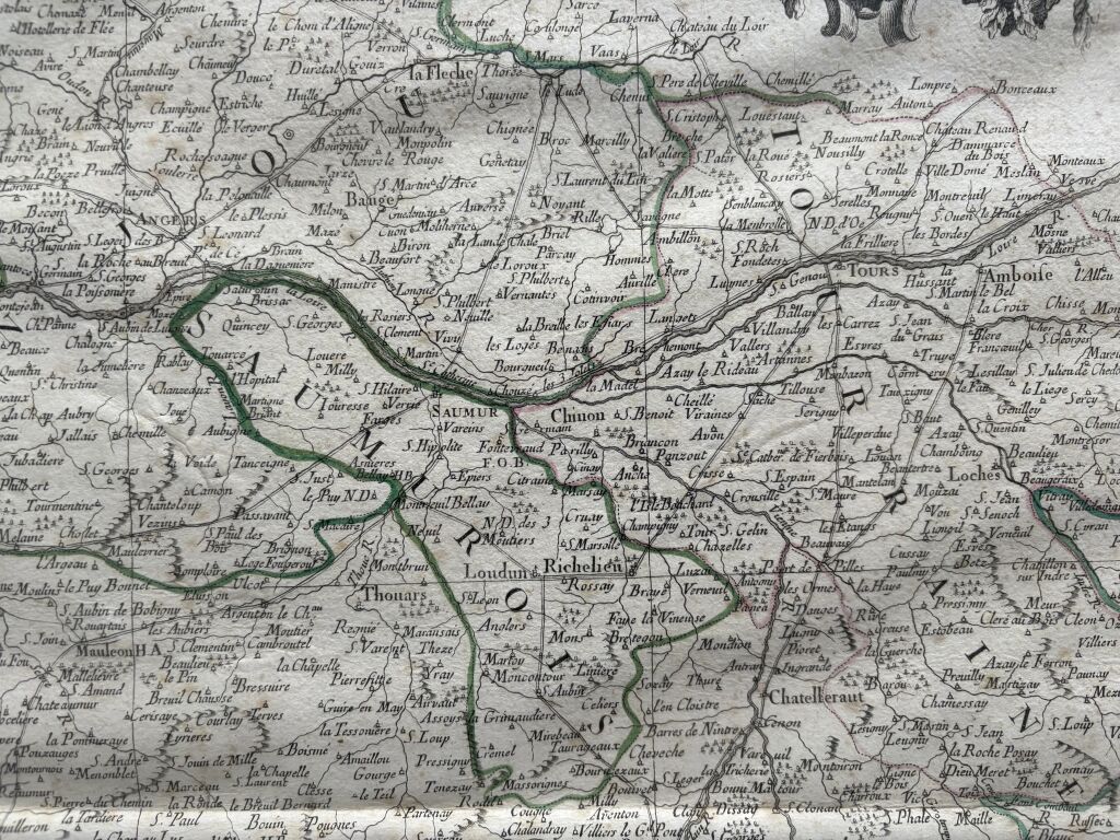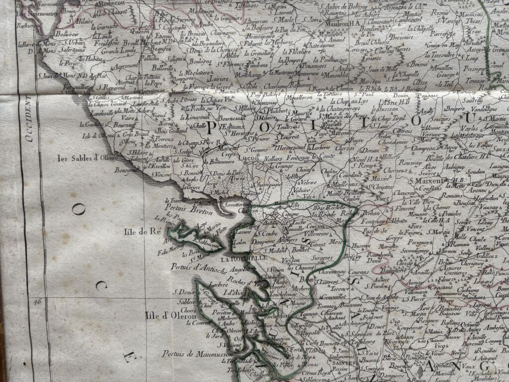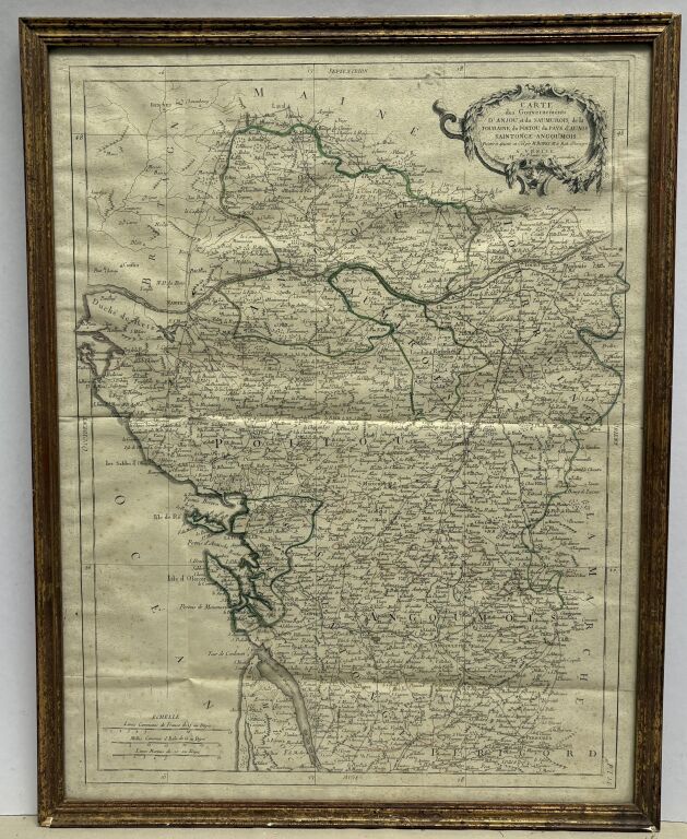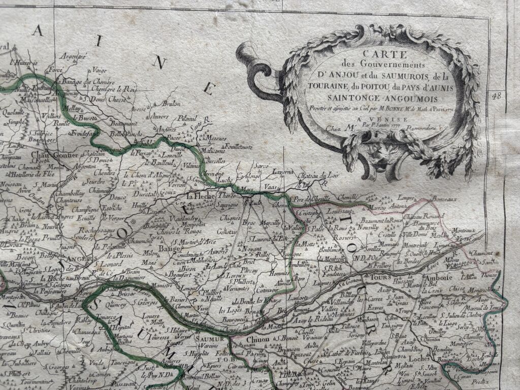 LOUIS XV - " CARTE des GOUVERNEMENTS D' ANJOU et de SAUMUROIS, de la TOURAINE, du POITOU, du PAYS D' AUNIS, SAINTONGE, ANGOUMOIS " dressée et projetée en 1771 par l'ingénieur Rigobert BONNNE, cartographe du Roi de France au service Hydrographique de la Marine. Belle gravure taille douce colorisée, sous verre encadré moulures bois doré 64 x 50 cm.