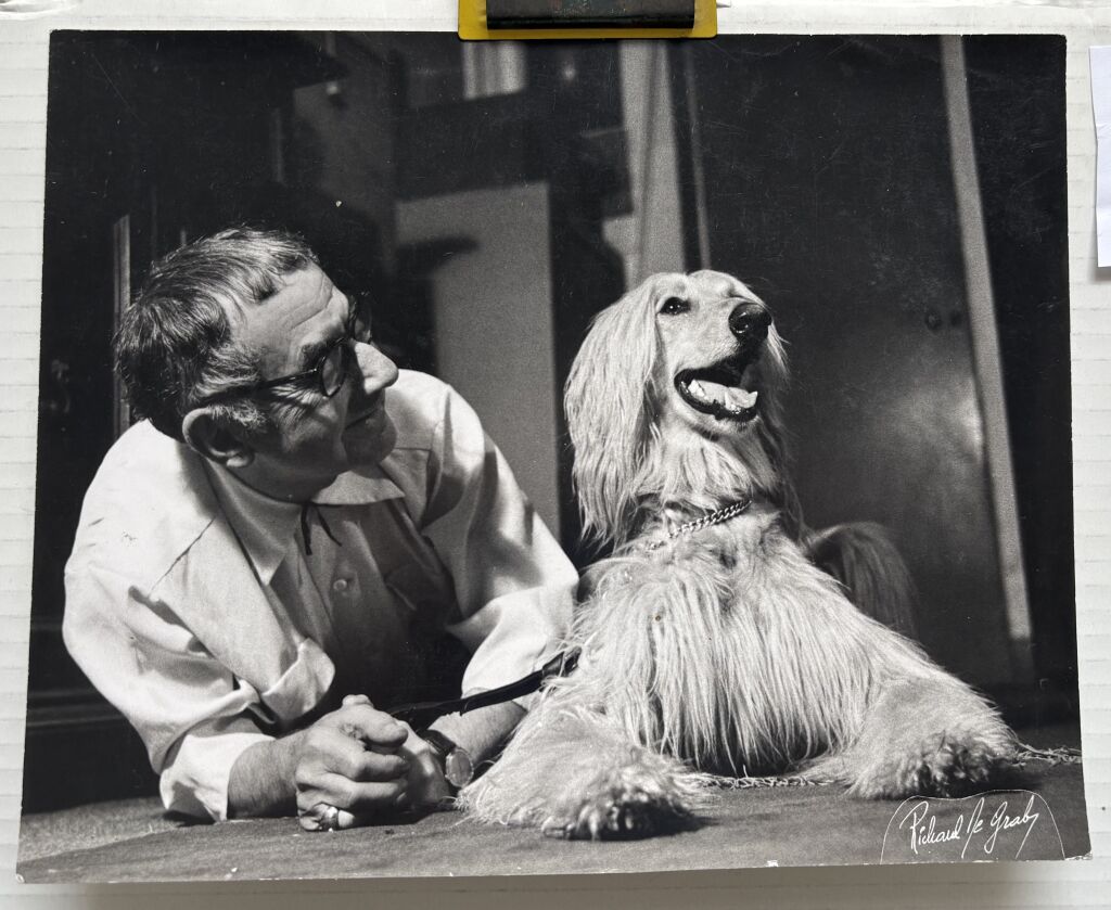 20 x 24,5 cm tirage argentique. Belle photo artistique portrait de man ray couché au sol et posant avec son chien. Porte au recto à droite signature du photographe et au verso cachet du photographe " paris - new York). - (circa 1960).