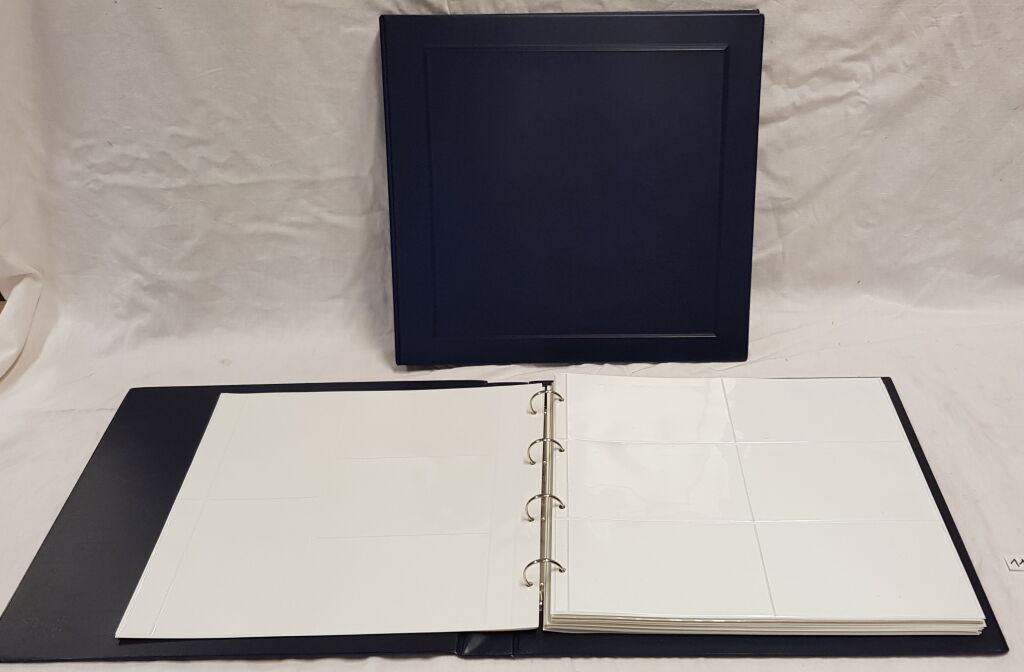 MATERIEL POUR CARTES POSTALES : 2 reliures mobiles bleues grande contenance de marque SAFE. Avec chacune 30 feuilles dimensions de cases variées 1, 2, 3, 4, 5, 6 poses, soit 120 pages rigides fond blanc, plastique sans chlore pour la protection totale de votre collection.