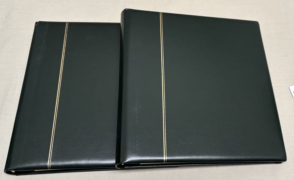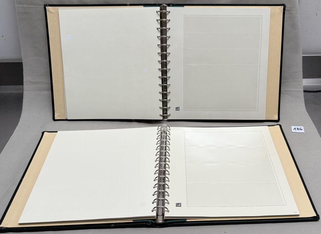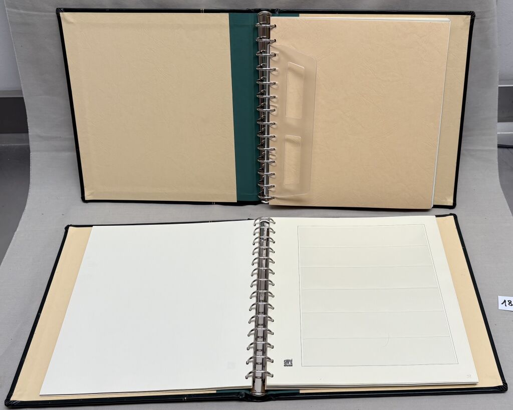 MATERIEL - SAFE - DEUX ALBUMS, reliures mobiles multi-anneaux " Skai ", fabrication luxe faîte à la main couleur verte (gamme 800), remplies de chacune 30 feuilles de la gamme " Garant ", feuilles neutres fond crème à bandes de hauteurs variables, pour classer les timbres comme bon vous semble, ou intercaler entre les pages de l'album pour le personnaliser avec vos documents particuliers. (gamme 600).