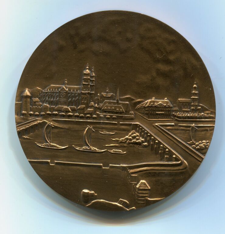 Armes de Tours couronnées mention 1833 - 1983. Revers : entrée de ville depuis les coteaux de St Cyr au 19e siècle. La Loire et la navigation fluviale, la cathédrale, St Julien,....