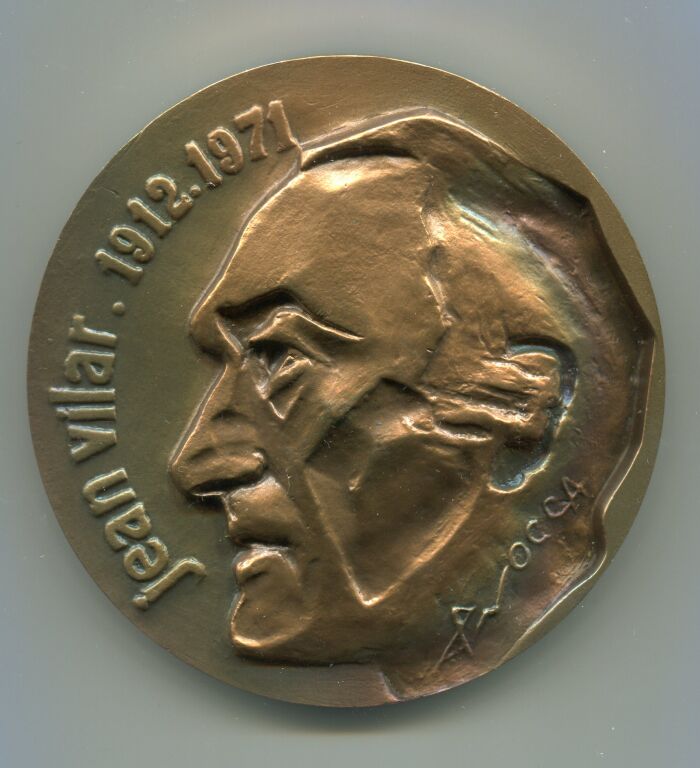 Portrait de Jean VILAR, sculpture haut relief signée NOCCA ( ** ) - revers : clefs d' Avignon et sceau du Théâtre National Populaire.