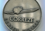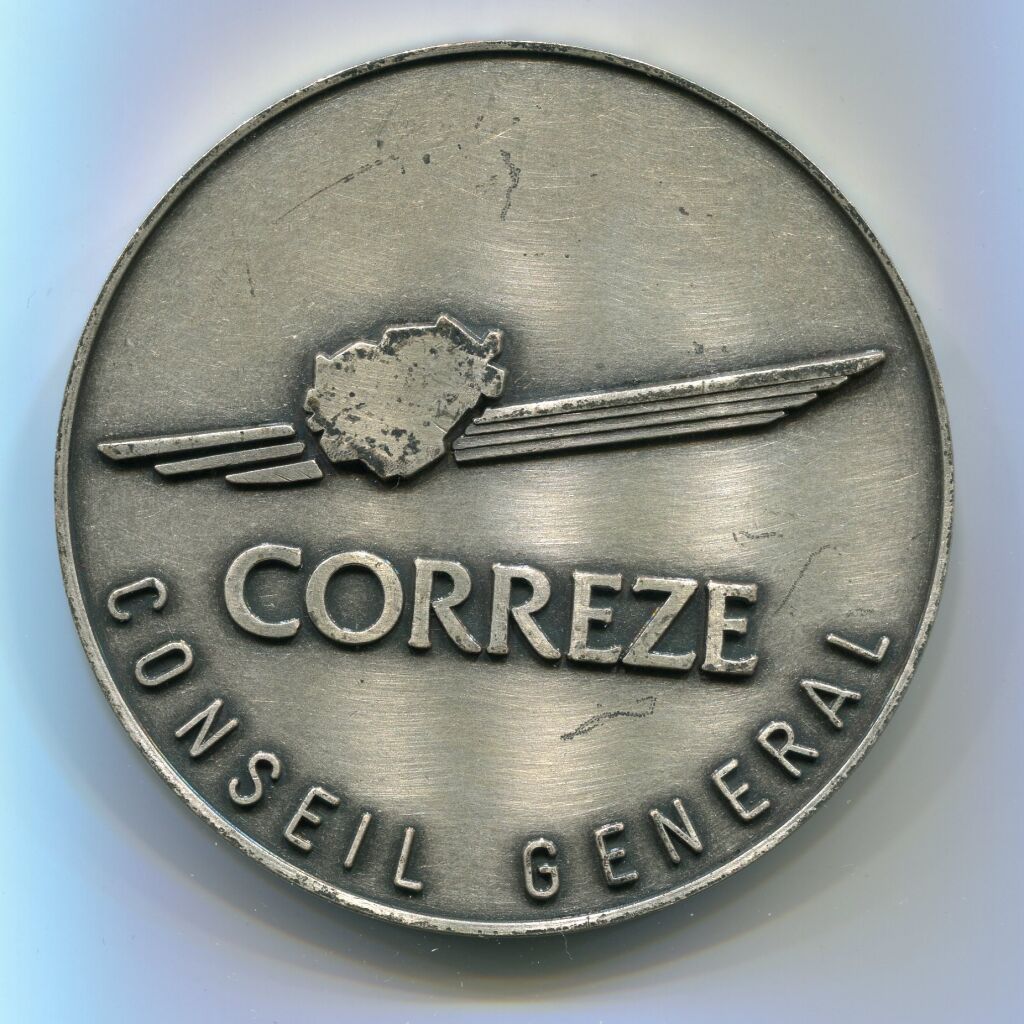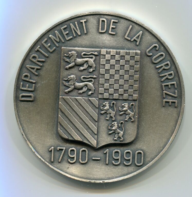 MEDAILLE honorifique du Conseil Général pour le BICENTENAIRE du département de la CORREZE 1790 - 1990. - ronde 68 mm - bronze argenté 104 grammes - Titulature et armes du département. - Revers pour attribution, carte et titre "Corrèze conseil général".