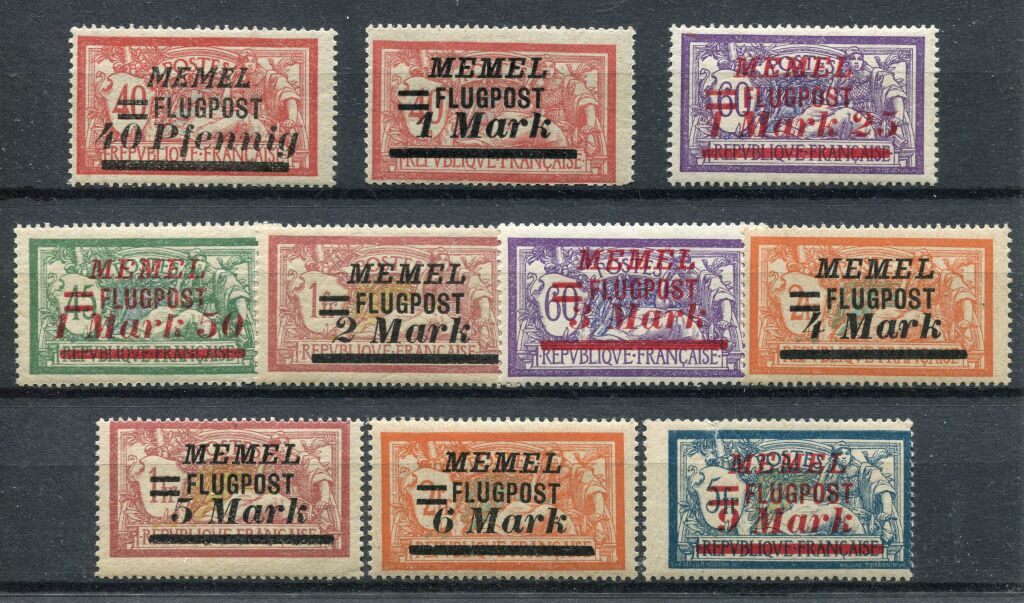 MEMEL 1922, administration française. - Série complète des dix timbres de France au type Merson avec surcharge " Memel Flugpost " - Avions 20 à 29, neufs **