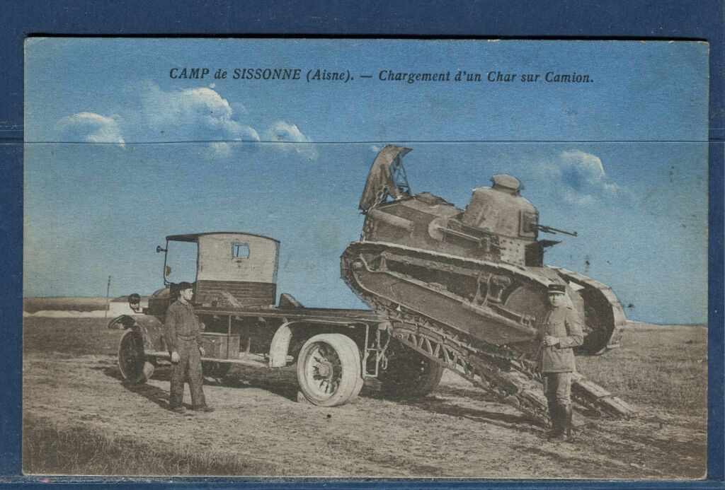 MILITARIA - CAMP de SISSONNE (02) - Chargement d' un CHAR sur camion. Gros plan circa 1925, animé, Char Renault FT 17.