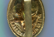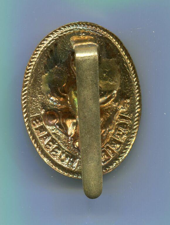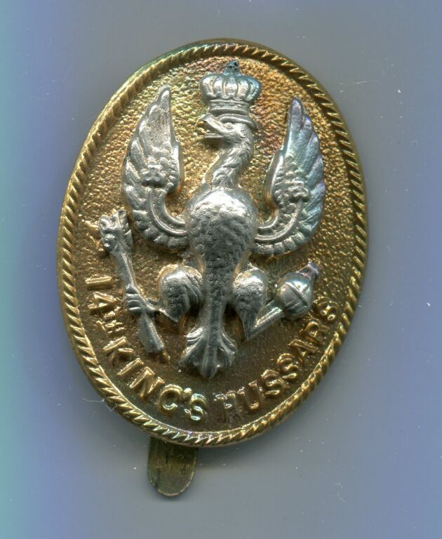 MILITARIA GRANDE BRETAGNE - 1914 / 1918 " CAP BADGE " INSIGNE de CASQUETTE du 14e HUSSARD ROYAL (14 th King's hussards) Estampé, Aigle Prussien argent dans un ovale doré tenant globe et main de justice. Représentation des armes de la Duchesse d' York, Princesse de Prusse, cette symbolique "allemande" fut abandonné en 1915. Un insigne éphémère fort rare.