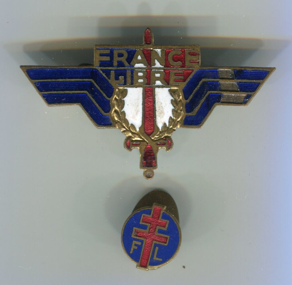L'ON Y JOINT : pour revers de veston insigne F L bleu foncé, croix de Lorraine en émail rouge.