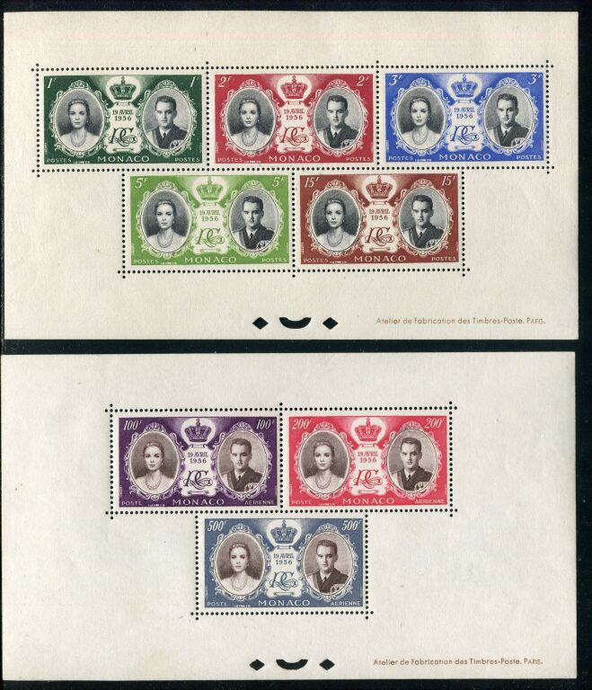 En deux feuillets 100 x 176 mm, série complète des 8 timbres, 473 à 477 + Av 63 à 65, portraits de Rainier III et Grâce Kelly - en bas à droite signature de " atelier de fabrication des Timbres Poste Paris " - les deux feuillets neufs **