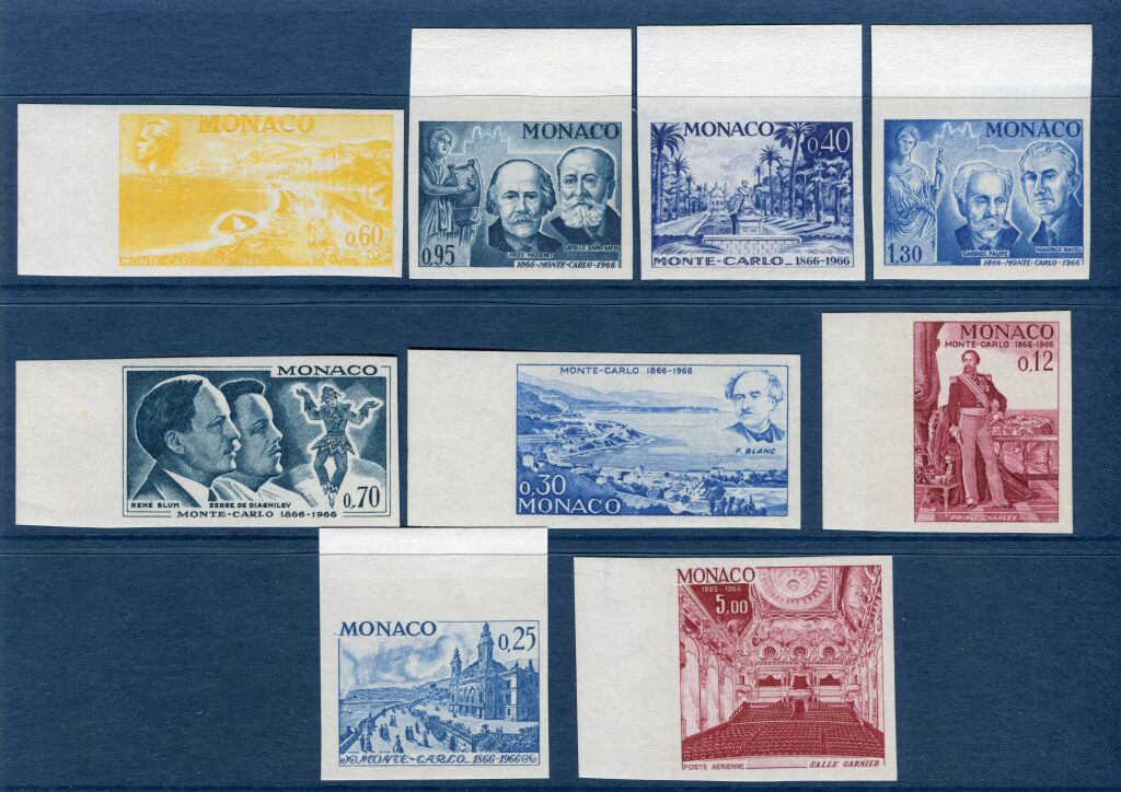 MONACO - CENTENAIRE de MONTE CARLO 1866-1966 - série complète des 9 timbres émis Opéra, Casino, lieux historiques n° 690 a / 697 a + avion 86 a.