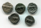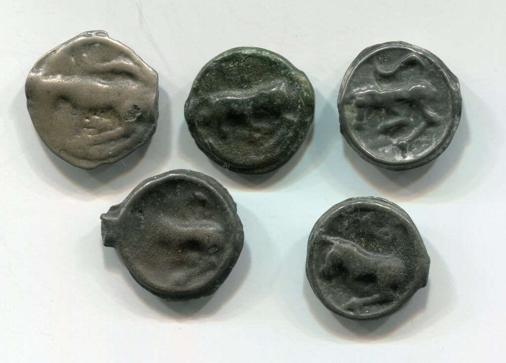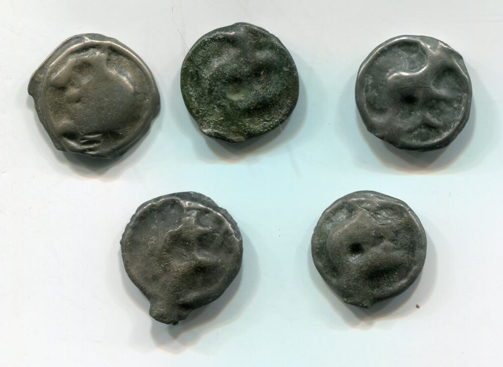 MONDE GAULOIS - MONNAIES des TURONES (Touraine ) - POTIN à la TETE DIABOLIQUE - 80 à 50 avant Jésus Christ - collection de 5 très belles monnaies différentes variantes de "frappe" (monnaies coulées), de tailles dont 2 avec trace de liaison dans le moule en chapelet, variante d'alliage (l'on employait à l'état natif, le plomb, l'étain, le cuivre). - à l'avers TETE STYLISEE profil à gauche, œil creux, nez pointu - au revers : taureau cornu queue relevée chargeant à gauche.