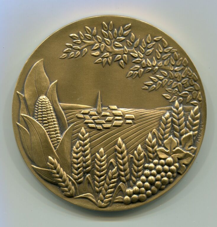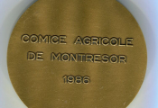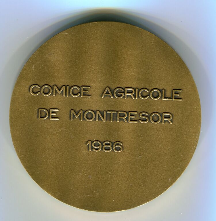 MONTRESOR (37) - COMICE AGRICOLE 1986 - médaille de bronze 65 mm, 151 grammes - Frappe Pichard à Saumur, œuvre du sculpteur Alain Kurylo : village stylisé en centre d'un champ ; en pourtour arbre stylisé, émis de mais, épis de blé, grappe de raisin.
