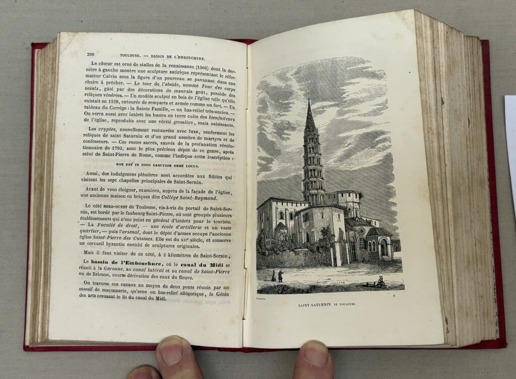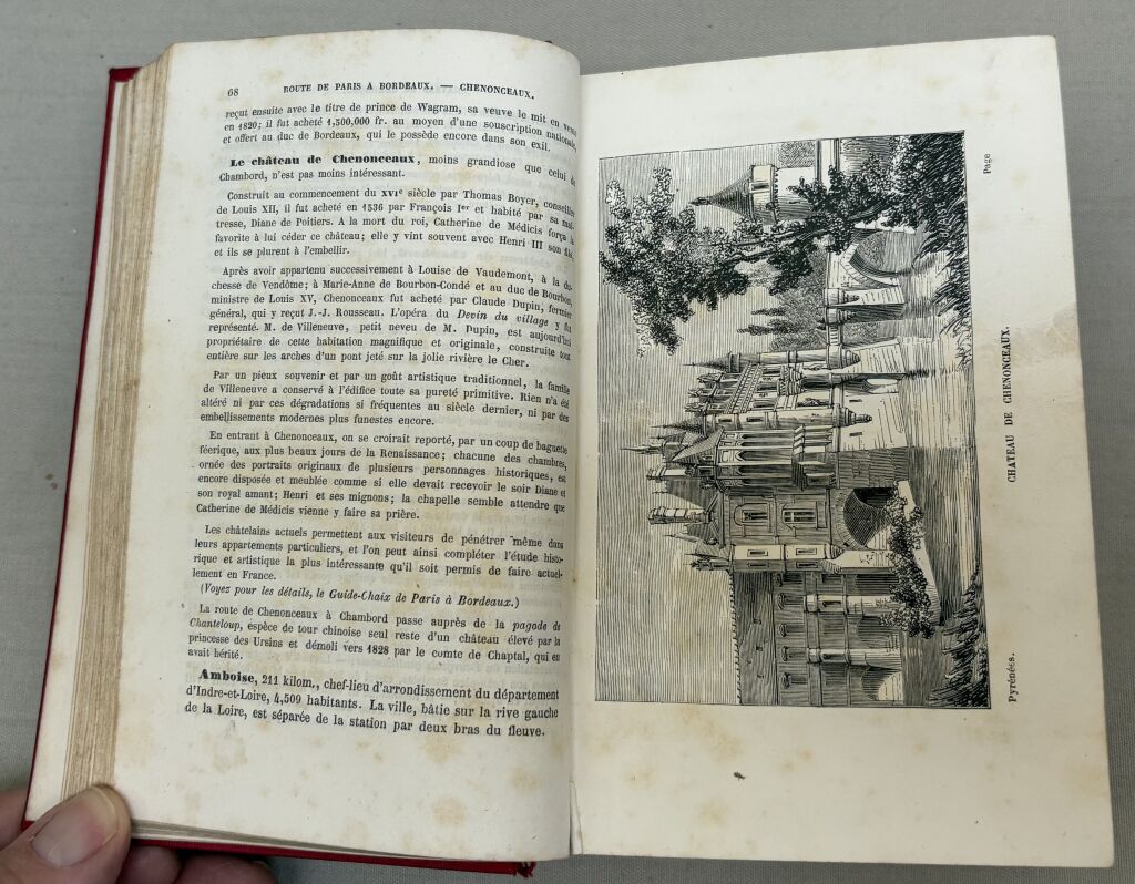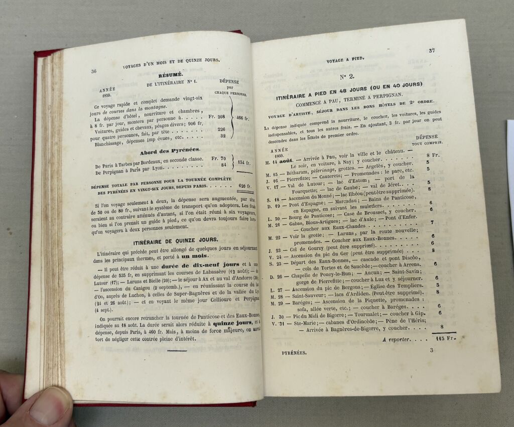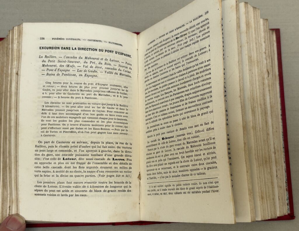 Remarquable ouvrage précurseur touristique du début du Pyrénéisme : cartographie in texte, villes décrites, ka chaine des montagnes françaises et espagnoles, le thermalisme "avec les analyses des dernières eaux ", itinéraires de très nombreuses excursions et ascensions à cheval ou a pied, les hôtels et auberges; les itinéraires des trains de Bordeaux à "Cette" et à Perpignan, 12 gravures d'illustration pleines pages hors texte, Minéralogie, Zoologie, l'aigle, l' Izard, plantes... les Basques : leurs allures, leurs caractères, leur langage, costumes des indigènes, les touristes anglais...