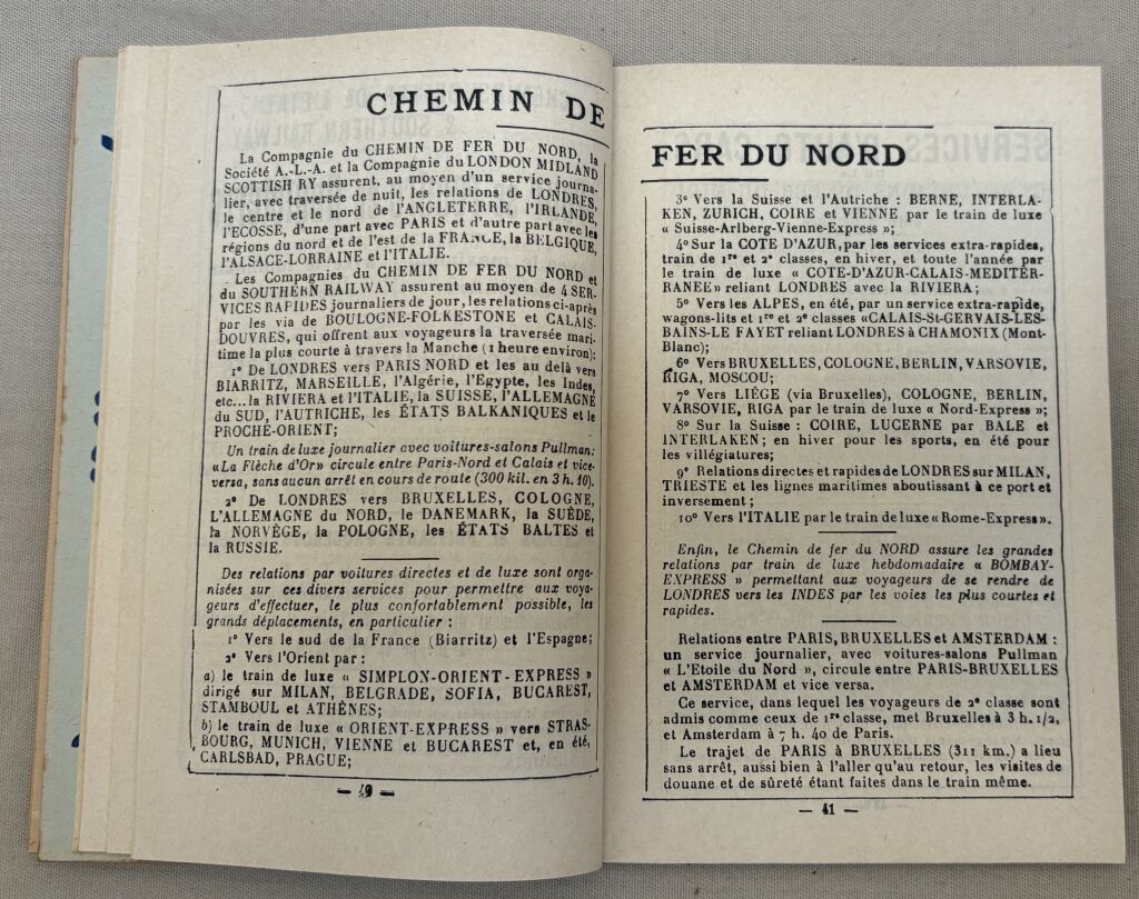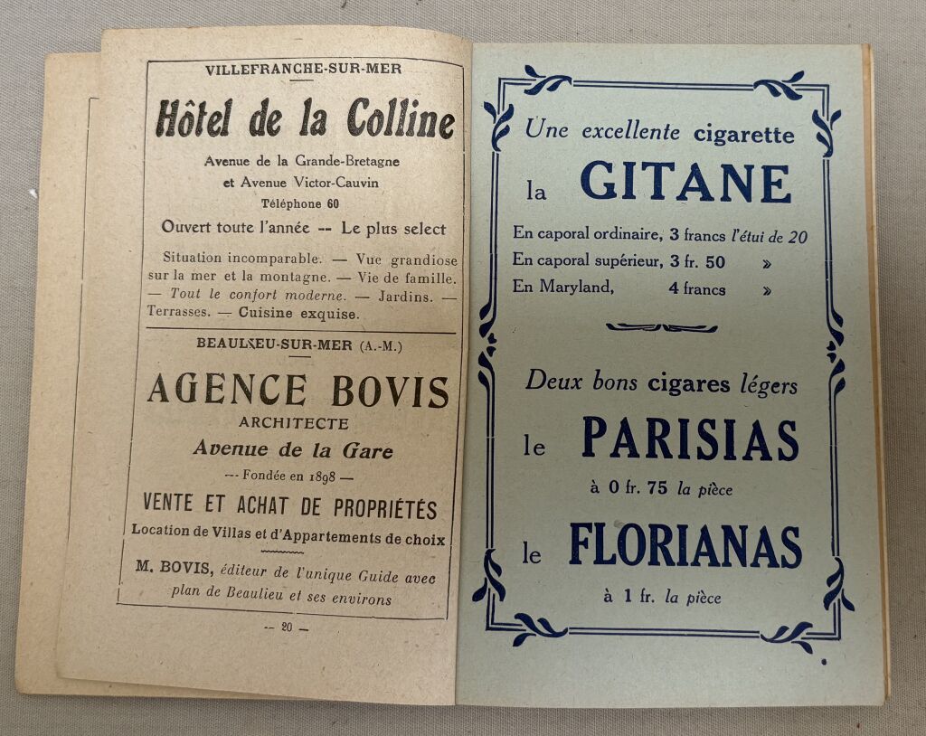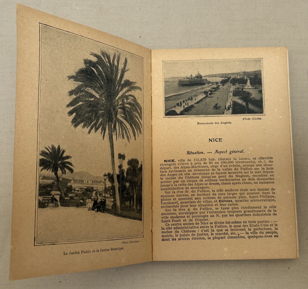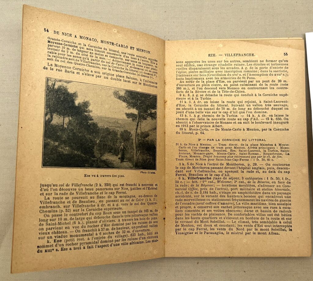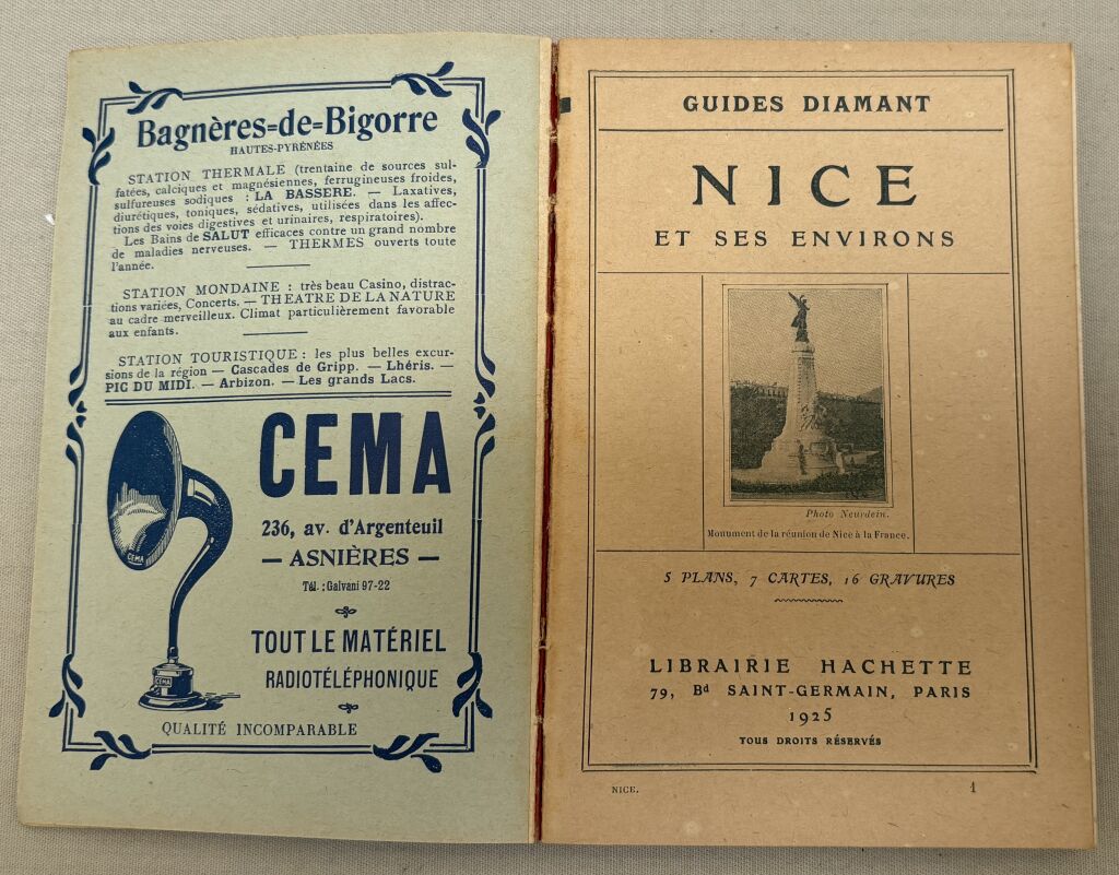 16 x 10,5 cm - 63 pages de texte touristique local - environ 90 pages de publicités locales et nationales, principalement sur l'hôtellerie, classées par villes alphabétiques - En tête d'ouvrage intéressantes publicités illustrées des grands hôtels de Nice et la cote d'azur, à l'époque centres mondains, disparus pour la plupart après guerre.