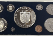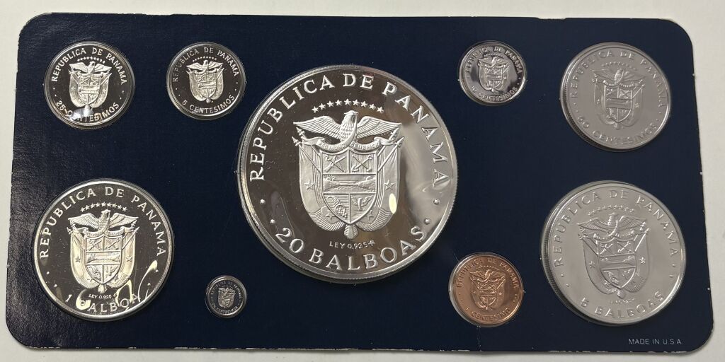 PANAMA 1975 - spectaculaire collection de neuf monnaies, série historique pour " honorer les hommes considérés au Panama comme des héros " : de la 1 centime à la spectaculaire pièce de 20 Balboa : la un centime en cuivre célèbre le chef indien Urraca qui résista à la conquête espagnole, la 50c en 2ickel le français Ferdinand de Lesseps constructeur du Canal, la 1 Balboa de 38 mm EN ARGENT 925 millièmes ( 26,73 grammes )Vasco Nunez de Balboa 1er européen " espagnol aventurier " à découvrir le pays, la 5 balboa en argent également (35,12 grammes), la spectaculaire 20 balboa honore Siùon Bolivar " le grand libérateur " ( diamètre 61 mm pour un poids d'argent 1er titre de 129,59 grammes !).