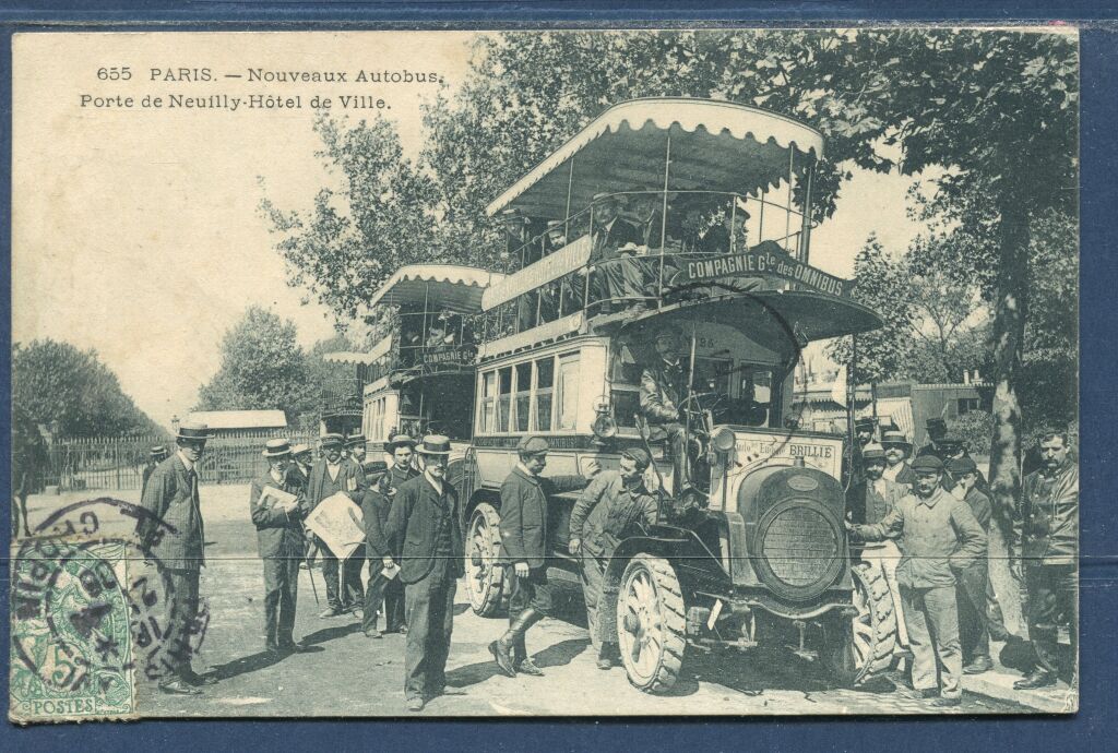 PARIS - carte postale 1906 NOUVEAUX AUTOBUS à IMPERIALE. Très gros plan très animé de 2 engins " de la Compagnie des Omnibus " des "automobiles Eugène Brillié, à roues pleines, à la Porte de Neuilly - Marmusse 655.