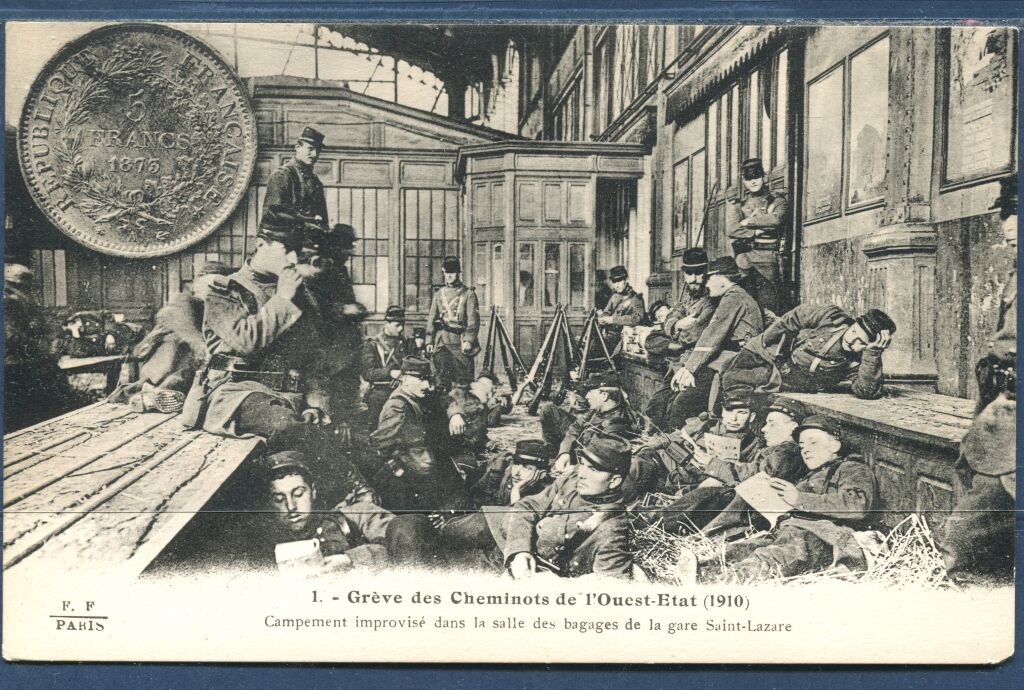 ( * ) - 8 octobre 1910, mouvement dit "grèves de la thune" nom argotique de la pièce de 5 francs, montant minimum de salaire exigé par les cheminots. Dur mouvement de grève national sévèrement réprimé a l'aide de l'armée par le pouvoir de centre gauche "Ministère Aristide Briand ".