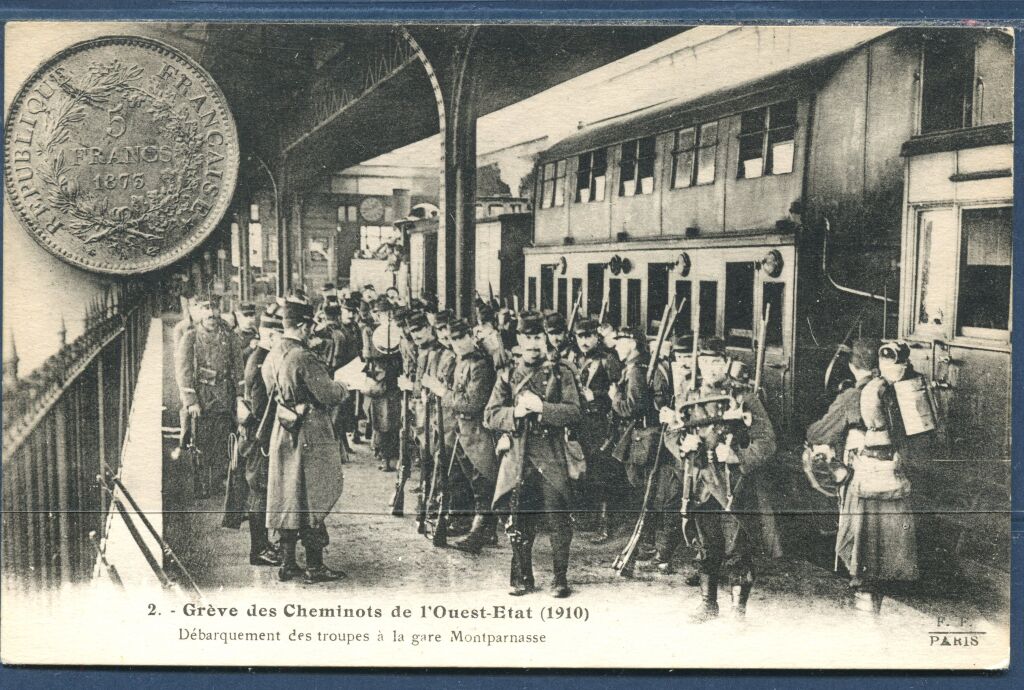 ( * ) - 8 octobre 1910, mouvement dit "grèves de la thune" nom argotique de la pièce de 5 francs, montant minimum de salaire exigé par les cheminots. Dur mouvement de grève national sévèrement réprimé a l'aide de l'armée par le pouvoir de centre gauche "Ministère Aristide Briand ".