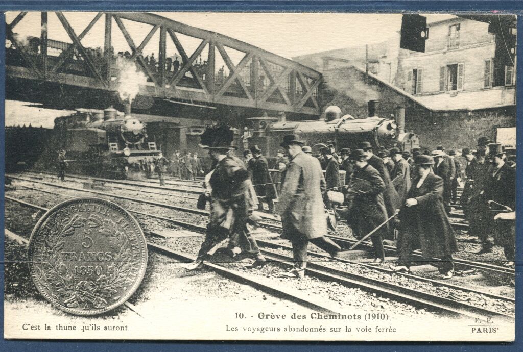 ( * ) - 8 octobre 1910, mouvement dit "grèves de la thune" nom argotique de la pièce de 5 francs, montant minimum de salaire exigé par les cheminots. Dur mouvement de grève national sévèrement réprimé a l'aide de l'armée par le pouvoir de centre gauche "Ministère Aristide Briand ".