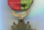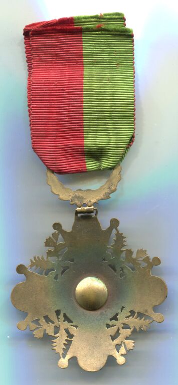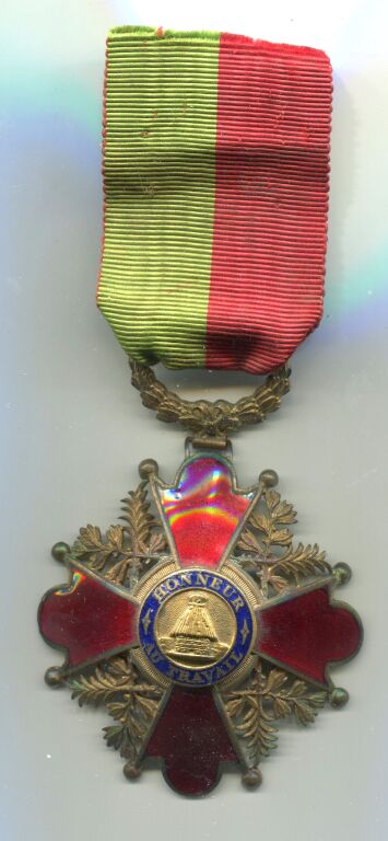 DECORATION pendante " HONNEUR AU TRAVAIL " - Quatre pétales émail grand feu rouge à terminaisons bouletées, entre chacun 2 palmes ajourées croisées, en centre or et émail bleu, ruche - le ruban est bicolore, séparé par moitié, vert et rouge.