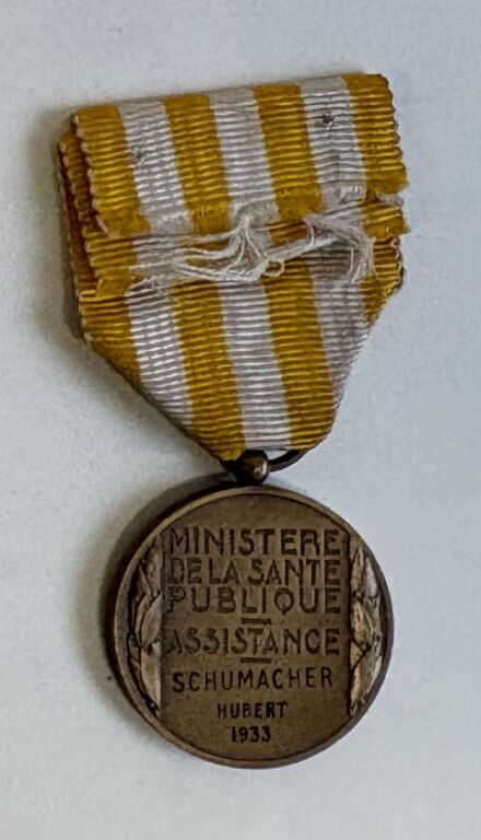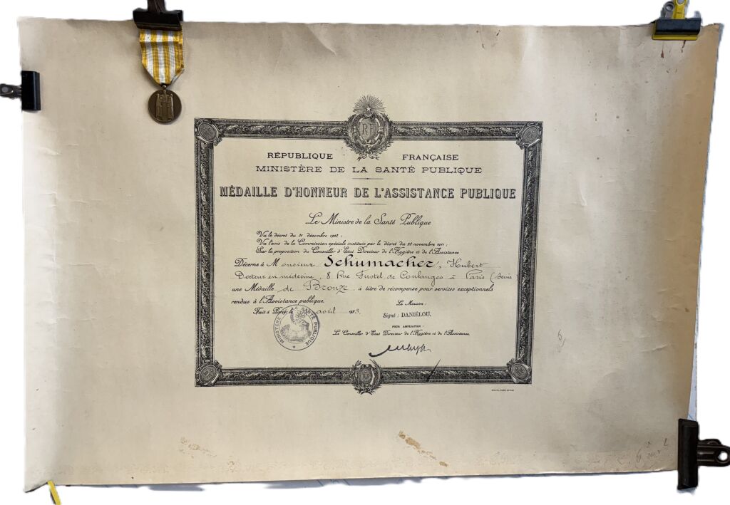 - Diplôme 38 x 56 cm, de l'imprimerie Fortin à Paris - Décerné à Schumacher Hubert, docteur en médecine, à titre de récompense pour services exceptionnels rendus à l'assistance publique. Fait à Paris le 14 avril 1933 + Deux signatures : ministre Daniélou (tampon) + conseiller d'état directeur de l' hygiène et de l' assistance.